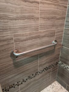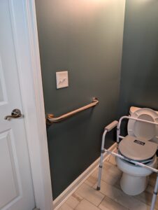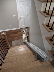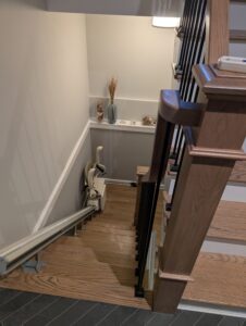 We are committed to helping our clients feel confident and independent in their homes. Our team completed a series of modifications for a homeowner who wanted safer access throughout daily routines and multi-level areas of the home. To improve bathroom safety, we installed a grab bar next to the toilet to assist with sitting and standing, as well as an additional grab bar inside the walk-in shower for secure support while bathing. This client also had a staircase that rises to a small landing, then continues up another flight. To ensure safe and easy access between these levels, we installed two straight stairlifts – one for each section of the staircase. This setup allows the client to move between floors comfortably and with confidence.